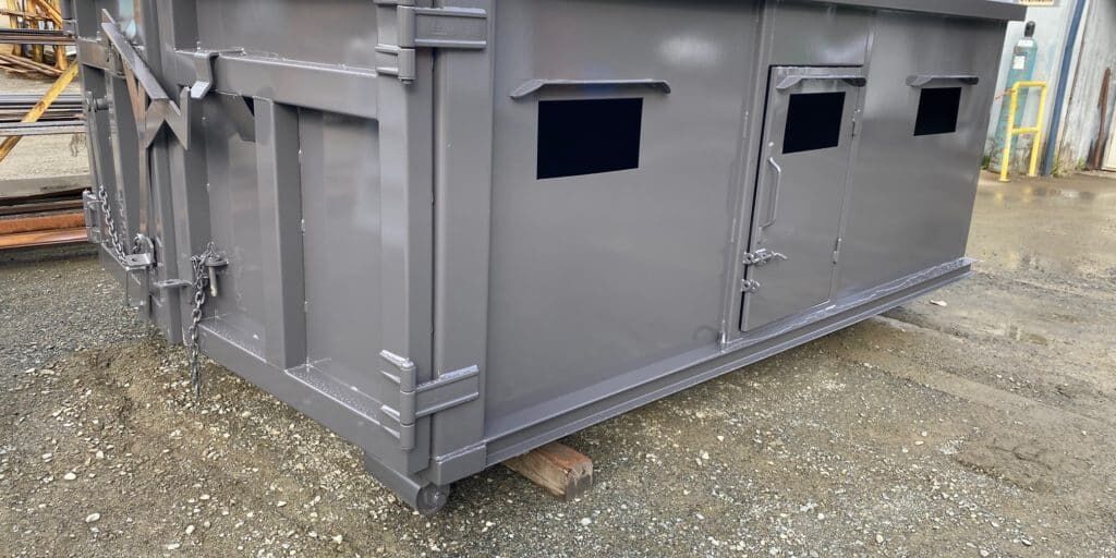 These modified Premium Mini Tubs were requested for use in a landfill, for collecting and segregating recyclable wastes such as glass and plastics. Through consultation with our design team, these units were specifically designed for the application by the customer. Features include a sealed fixed roof to keep the contents dry. Slats in either side to allow landfill customers to easily place materials into the container and a small man door to gain access when required. These units were set up for a smaller Palfinger 36” hook lift system and have Barn Doors on the rear for unloading. As per the customers request the container was painted Fendt Gray.